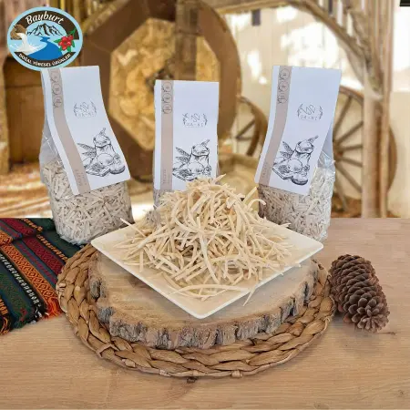 Bayburt’un geleneksel mutfağının vazgeçilmezlerinden biri olan ev yapımı erişte, tamamen doğal ve katkısız malzemelerle el işçiliğiyle hazırlanır. Bölgenin taze buğdayından elde edilen un ve su ile yoğrulan hamur, özenle açılır ve ince ince kesilir. Ardından güneşin altında kurutularak, özgün lezzeti ve kıvamı korunur. Bayburt ev yapımı eriştesi, özellikle kış aylarında etli yemeklerin yanında veya yoğurtlu tariflerde mükemmel bir tamamlayıcıdır. Doğal ve sağlıklı beslenmek isteyenler için ideal olan bu erişte, geleneksel Bayburt sofralarına sıcak ve samimi bir dokunuş katar.